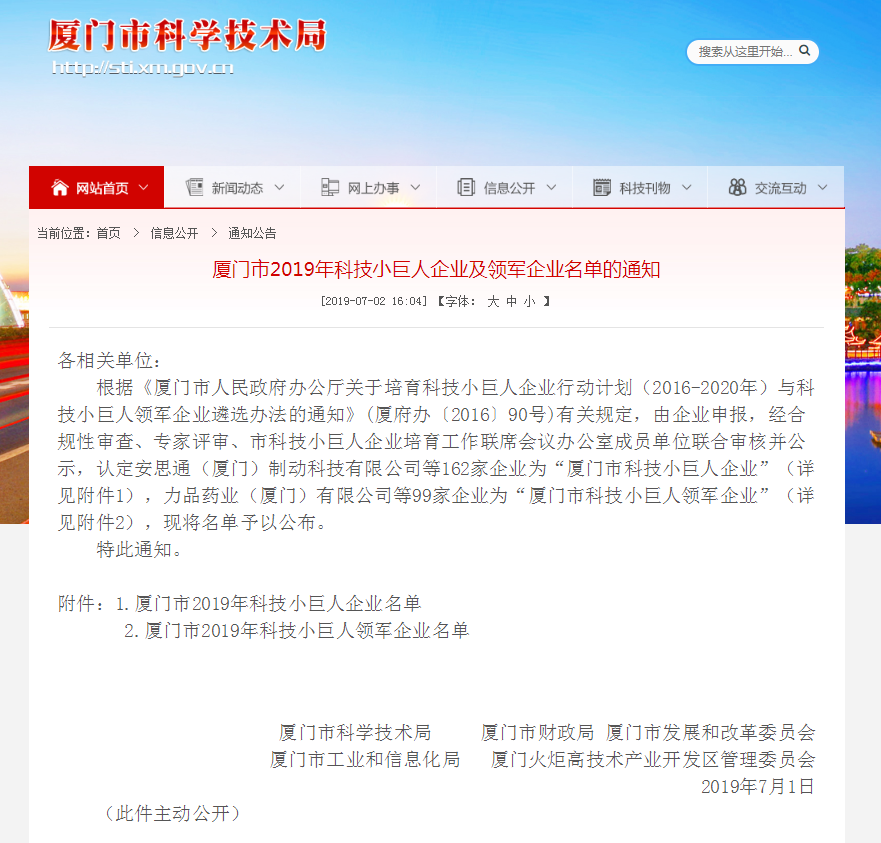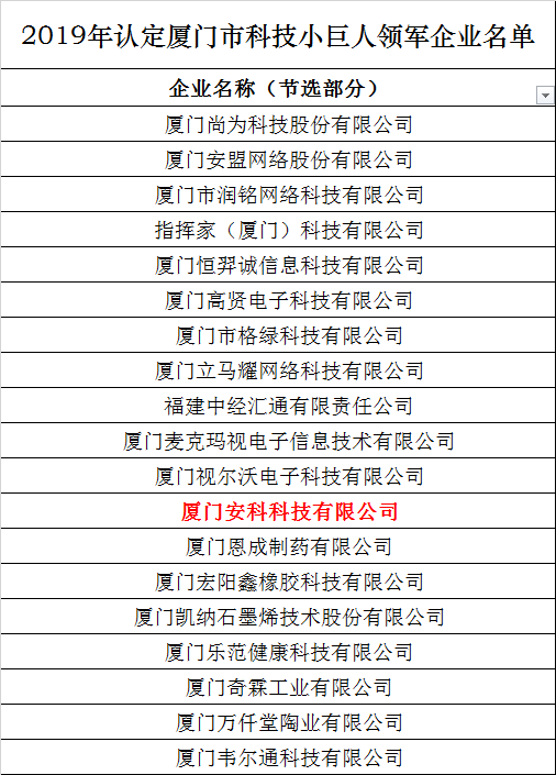 近日,廈門市科學技術局公布了廈門市2019年科技小巨人企業及領軍企業名單,廈門安科科技有限公司(下簡稱:廈門安科)作為極具潛力的新興企業代表榮獲“廈門市科技小巨人領軍企業”稱號。
